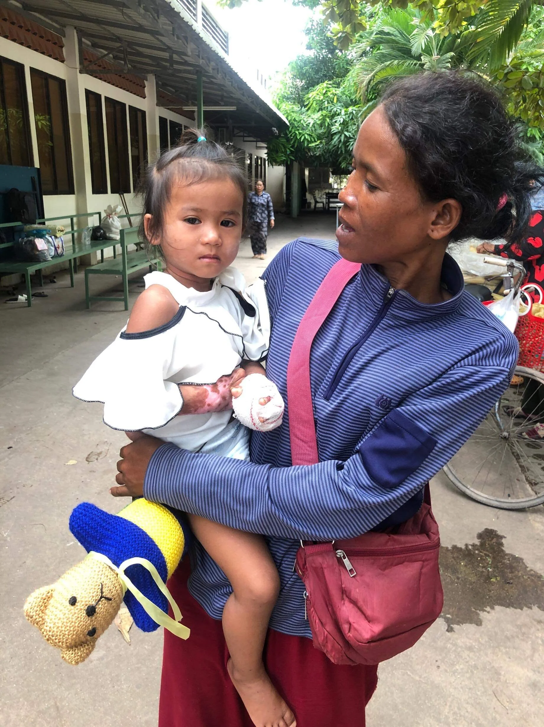 As part of sustainability, we follow up on the numerous referrals and work with local teams in Cambodia. We found this 5-year-old with third-degree burns. Her hands scarred, the skin thickened, her fingers webbed, and in need of immediate surgery and therapy. We have referred her to the burn unit of NGO hospital. They have already performed a number of surgeries, one hand at a time.